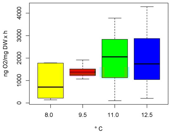 We assessed a significant heterogeneity among group variance, which was due to the higher data dispersion at 11.0 and 12.5 °C than at 8.0 and 9.5 °C. However, OCRs significantly varied with temperature (PERMANOVA; Pseudo-F3,53 = 3.63, p-value = 0.016, perms = 999; Table S1). The post hoc comparisons indicated significant differences (p-values < 0.05) in OCRs, except for 9.5 vs. 12.5 °C (t = 2.2533; p-value = 0.033) and 11.0 vs. 12.5 °C (t = 0.8791; p-value = 0.061). Average OCRs at 9.5 °C were 1.5-fold the OCRs at 8.0 °C (t = 2.9108; p-value = 0.007), at 11.5 °C were 2.2-fold (t = 2.3638; p-value = 0.022) and at 12.0 °C were 2.1-fold the OCRs at 8.0 °C (t = 2.2986; p-value = 0.028; Figure 5).