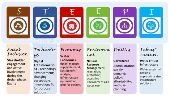 WSAA is an industry body providing urban water services in Australia. The organisational context here concerns influencing, promoting, improving and fostering within and between urban water and sustainability in water services. The aims and objectives of WSAA are collaboration and support, which removes the need for the organisation to become involved in its member organisations’ procurement and management of funds and infrastructure and technological needs. Resulting from this, WSAA recently published a document specifically defining the role of IWCM. It categorises IWCM into three major components: (1) management targeting sustainability outcomes, (2) planning targeting liveability outcomes and (3) stakeholder collaboration targeting resilience outcomes []. These categories are aligned with three of the six STEEPI categories: (1) NRM, (2) governance and (3) social inclusion, as presented in Figure 11.