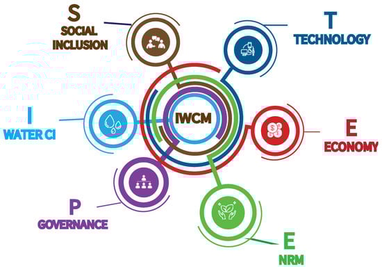 The existing conceptual IWCM interpretations were classified and colour-coded into six STEEPI categories: (1) social inclusion, (2) technology, (3) economy, (4) natural resource management (NRM), (5) governance and (6) Water CI—as presented in Figure 2. Figure 2 is used as a template to re-interpret, analyse and illustrate the nine IWCM interpretations discussed in this paper.