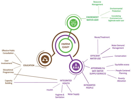 IWRM-GWP promotes IWRM as a process for improving water governance and management []. IWRM focuses on people-centric planning addressing poverty and promotes hygiene and education by undertaking extensive consultations. Regulations, institutional frameworks and finance are not addressed and are assumed to be addressed by the organisations’ understanding and interpretation of what an IWRM framework should be. A study by Dinar [] found that regulations, socio-economics and financial viability are the key drivers to any major program design and implementation. The decision to address their management lies with the responsible authority and is aligned with the IWRM-GWP’s conceptual framework.