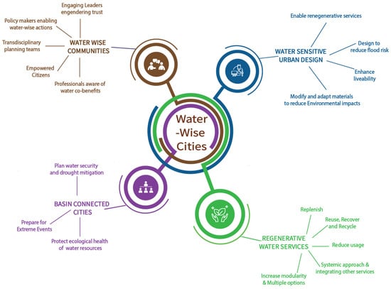 Water-sensitive urban design is categorised as services and technology options, regenerative water services as environmental protection, basin-connected cities as governance measures and water-wise communities as social inclusion initiatives.