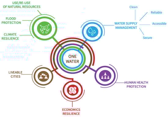 The One Water concept focuses on environmental issues related to water, such as pollution control, climate resilience, economic resilience, liveable cities, human health protection, the re-use of natural resources and water supply management. Safe, secure and access to clean water are addressed as sub-major components of water supply management, whereas social inclusion is captured through stakeholder collaboration and community engagement. Funding for the projects is captured under economic resilience.