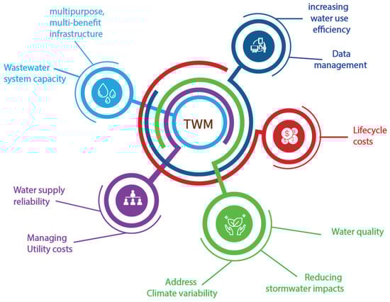 TWM is defined as strategies for utility master planning []. It is an approach that seeks a better management and efficiency of water resources and breaks down institutional barriers that separate water into silos of drinking, wastewater and stormwater []. It is referred to as adaptive plans that can formally address the risks and uncertainties of forecasting the water supply and demand needs [] and as an implementation planning tool [].