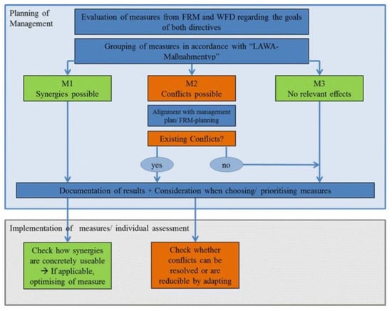 The management plan (Figure 9) summarised by La¨nderarbeitsgemeinschaft Wasser (LAWA), a federal working group established to coordinate water-related issues and regulations and to implement the European directives, is cited by Evers [] and notes an approach for identifying and coordinating synergies between WFD and the Flood Directive. The approach is based on adjusting the available options, proposed measures and potential results, as shown in Figure 8. The compilation of proposed measures was published to implement WFD’s IRBM system [].