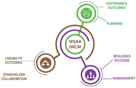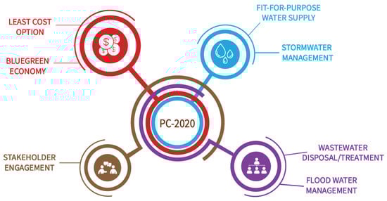 All five Australian concepts emphasize stakeholder engagement and long-term planning but focus on different water management areas. The PC’s main 2020 focus is the ‘blue–green economy’ (environmental) and ‘least-cost option’ (economics) of water management; WSAA-IWCM leans towards resilience and liveability outcomes—social aspects of water management; IWMF focuses on communications and governance measures; and IWCM, DPIE-NSW focuses on the governance structure. There is an assumption that the water management responsibilities pertain to councils in rural–regional areas and to local water utilities in the greater metropolitan regions of Australia. South Australia is the country’s only state with a single agency to manage water supply and demand for the whole state. These five interpretations are discussed in Section 4.1. to Section 4.5.