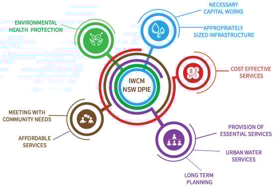 The Productivity Commission in Australia is a strong promoter of the IWCM concept in the context of water pricing and charges. In 2020, an independent report was commissioned to investigate the implementation of IWCM in Australia. In this report [], IWCM is defined as a tool to achieve water security via addressing the key functions of urban water management: supplying fit-for-purpose water; wastewater management (appropriate disposal/treatment); stakeholder engagement and involvement; storm and flood water management; and the least-cost option for the provision of services for a blue–green economy.