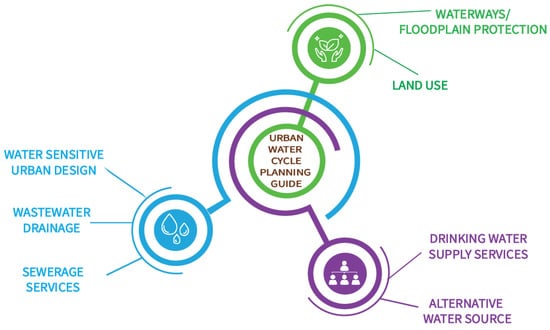 The first Global IWCM interpretation, as defined by GWP, is referred to as IWRM. The IWA refers to its version of IWCM as Water-Wise Cities. In the US, the concept that addresses water challenges and is aligned with IWCM is One Water. The TWM in the US is an implementation planning tool developed with the aim of providing better water services at affordable prices []. In the EU, WFD is a step towards a single system of managing an entire river basin and is viewed as a form of IWCM []. In contrast, in Australia, IWCM is implemented at the local utility level with a specific focus on stakeholder involvement and liveability by Water Services Association Australia (WSAA), least-cost options identified by the Productivity Commission (PC) for an infrastructure option that is appropriately sized and provides high service levels [], and the Urban Water Cycle Planning Guide (UWCPG) designed by Barwon Water is a tool to develop an implementable IWCM strategy.