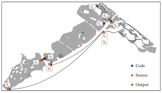 With the specified flow boundary conditions, the north domain C1 serves as the inlet boundary, and the north domain C2 serves as the outlet boundary. According to different water quality conditions (Figure 3), the model sets up eight source sinks from the east domain outflow S6 to the south domain inlet S1, from the east domain outflow S8 to the middle domain inlet S7, from the south domain outflow S2 to the middle domain inlet S3, and from the north domain outflow S4 to the east domain inlet. This is performed to account for the impact of wind on the local lake flow.