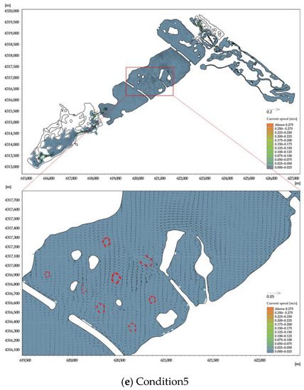 The average water exchange period in Condition 5 is 80 d, which is 1.5 times higher than that in Condition 1. Among them, the water exchange period in the middle domain is 86 d, and that in the north domain is 156 d, which are 79% and 37% higher than that in Condition 1, respectively. It indicates that the reduction of the inlet flow will significantly affect the regional water exchange capacity and cause the water exchange cycle to be prolonged.