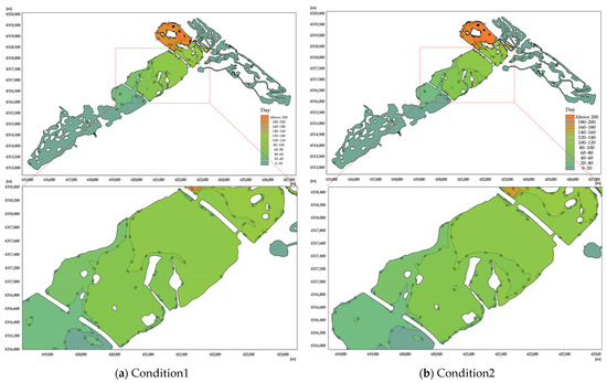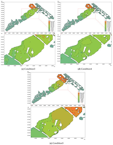 The number of days of water replacement in each domain of Xinghai Lake under six conditions was calculated by simulating 214 d of the water replacement cycle. The water exchange cycle of Xinghai Lake is spatially heterogeneous, as can be observed in Figure 5 and Figure 6. The general features of the water body renewal period in the southern lake region are quick, and those in the northern lake area are sluggish.