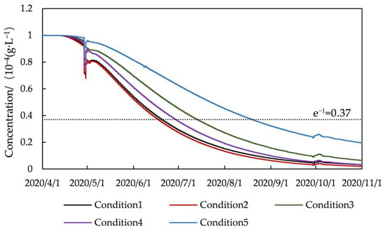 Under the aforementioned circumstances, Xinghai Lake’s water renewal period is simulated. Figure 7 shows the concentration–time curve for the middle domain observation point. According to the findings, the residual mass of preserved material in the lake is a time-dependent function. The residual conservative material in the lake steadily diminishes with time and goes to zero, but its value is never zero, indicating that residual un-excluded material exists in the lake at all times. Because the observation point is closest to the active water flow line and has the shortest water flow path among them, the water flow diffusion to this location collides with the artificial island and changes direction, impeding the diffusion to the north and resulting in the oscillation of water body exchange. The water renewal time of the observation points for Condition 3 and 5 slows down significantly when the diversion flow of S3 decreases. This is because the lake area in which the observation point in the middle domain is located is affected by the throughput flow, and when the incoming water flow is low, there is not a significant difference in the water renewal period between the observation points for Condition 1 and 2, as can be seen from Figure 7.