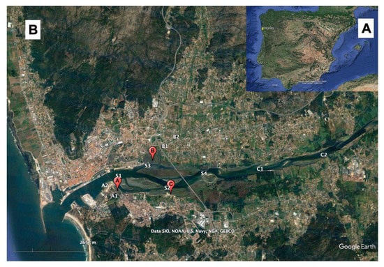 In February 2022, water samples were also collected at different sites along the saltmarsh and at some possible pollutant sources (Figure 1). Water samples were collected in 1 L glass bottles previously decontaminated (thoroughly washed with deionised water and ethanol).