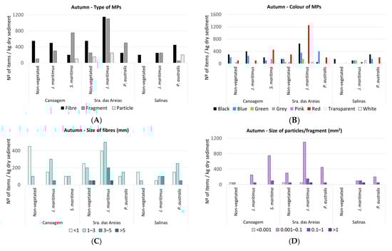 In the present study, in general, vegetated sediment had higher amounts of MPs, with the most frequent type of MPs in non-vegetated sediments being fibre, followed by fragments; whereas for vegetated samples, all types of MPs were present in almost the same proportions. Variable distributions of MPs, such as higher amounts of fibres in non-vegetated mudflats than in vegetated areas, have been observed in some studies []. Therefore, the presence of plants in the sediment can also affect the distribution and retention of MPs, which can also vary with MPs shape and density.