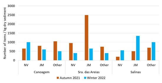 MP values observed in sediment samples varied between 250 and 2500 number of items/Kg dry sediment. Although direct comparison between MPs concentrations in different locations should be carefully carried out, because different sampling and analytical methodologies are used to quantify MPs [,] and the values currently observed are considerably high, higher than values reported in sediments of other estuaries around the world []. Nevertheless, the number of studies on estuarine areas is still low, and the current work contributes to data on MPs amounts in these areas.