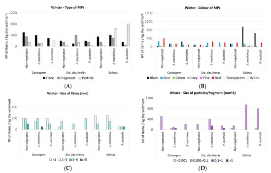 MPs content (number of items per kg of analysed dry sediment) and characterization from sediments collected in winter (February 2022), discriminated by: (A) Type of MPs; (B) Colour of MPs; (C) Size of fibres (mm); (D) Size of particles and fragments (mm2).