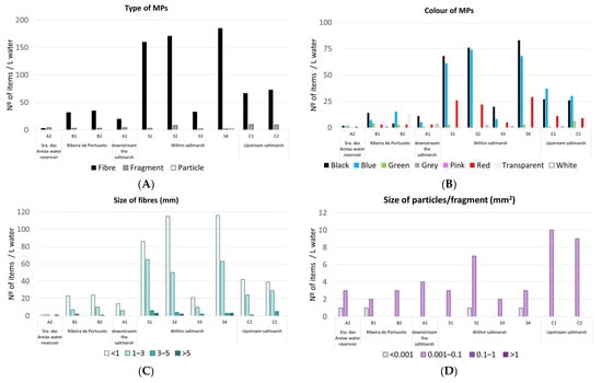 MPs content (number of items per L of water) and characterization from water samples collected in winter (February 2022), discriminated by: (A) Type of MPs; (B) Colour of MPs; (C) Size of fibres (mm); (D) Size of particles and fragments (mm2).