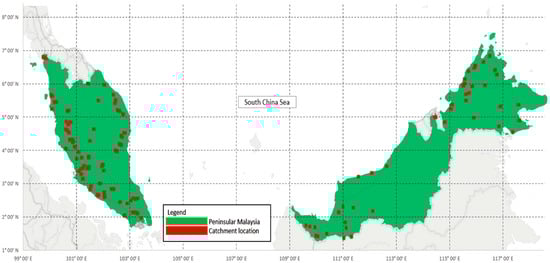 This study utilized data collected by the Department of Irrigation and Drainage (DID), a Malaysian federal agency. DID’s Hydrological Procedure no. 11 (DID-HP 11) gathered 474 pairs of rainfall runoff data from watersheds across Malaysia from 1964 to 2016, while DID’s Hydrological Procedure no. 27 (DID-HP 27) collected 227 pairs of rainfall runoff data from 1970 to 2000 [36,37]. The study combined both datasets, resulting in a total of 701 rainfall runoff datasets (rainfall range: 7–575 mm) collected from 1964 to 2016 for analysis. Thus far, this study has utilized the most extensive and up-to-date compilation of rainfall runoff data provided by the Malaysian federal agency, which encompasses a wide range of rainfall amounts. Figure 2 shows the catchment areas in Malaysia.