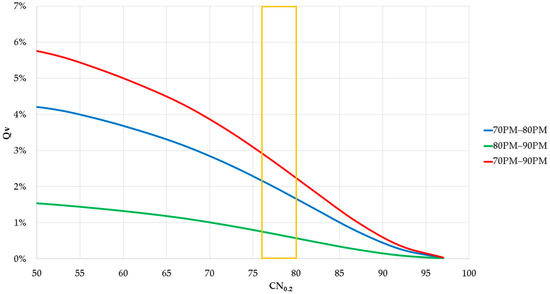 By substituting the best correlation equation (Equation (8)) back into the SCS curve number (Equation (9)), the conventional curve number for the 70PM can then be calculated with Equation (11).