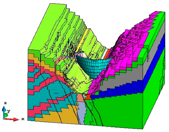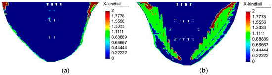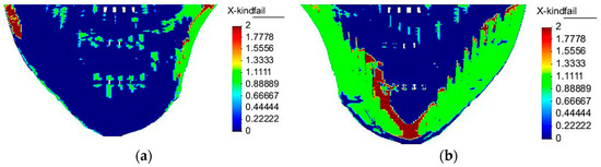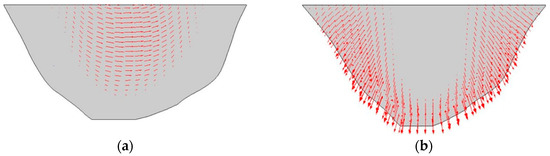 In Equation (5), is the first invariant of stress tensor; is the second invariant of deviatoric stress tensor; and are the material parameters, which are related to the friction angle and cohesion of the material. The values of and were determined according to the following formula so that the Drucker–Prager yield surface is close to the Mohr–Coulomb yield surface.