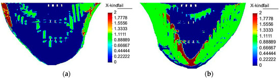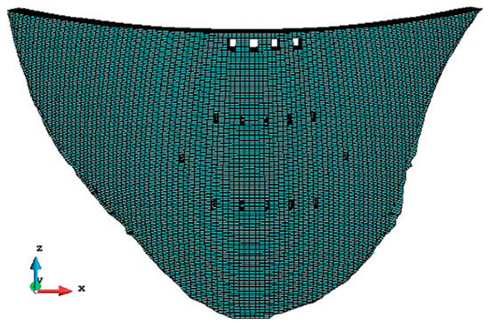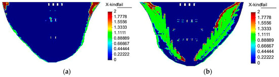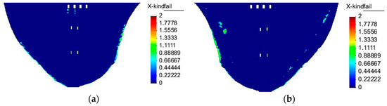Figure 5 and Figure 6 show the distribution of the yield zone of the arch dam under different expansion values in basic load combination I (‘0’ means unyielding; ‘1’ represents the tensile yield; ‘2’ is the compression–shear yield). It demonstrated that the yield zones at the upstream and downstream arch ends gradually expanded with the deformation of the arch dam. When the deformation value reached 200 με, the downstream dam surface near the left and right abutments yielded at the upper elevation. Then, with the further development of expansive deformation, the yield zone continuously extended and was partly connected at the high elevation of the right bank foundation surface along the upstream and downstream surfaces when the deformation value reached 800 με.