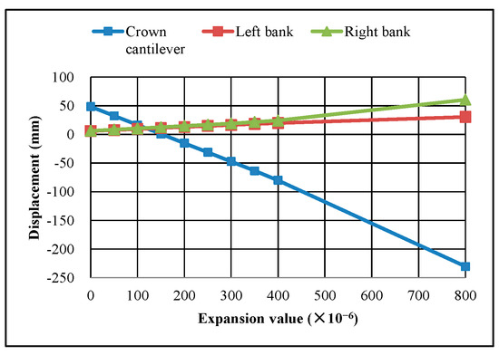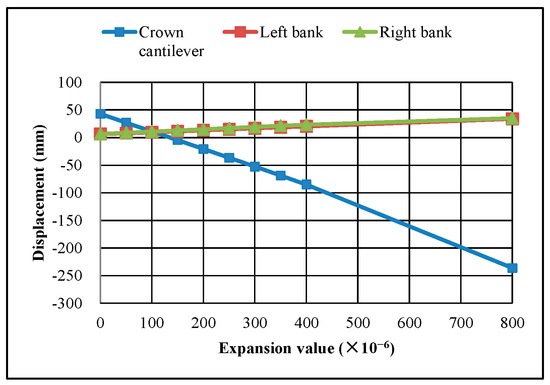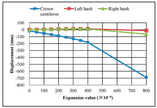 Figure 15 shows the change process of dam crest displacement along the river under different expansion values in basic combination I. Under the normal water level + temperature rise condition, the deformation of the crown cantilever along the river gradually changed upstream with further expansion, whereas that at the dam abutment varied downstream. However, the deformation did not change suddenly, indicating that the overall dam body was in a linear elastic state when the expansion value was lower than 800 με, and no instability and failure occurred on the whole.