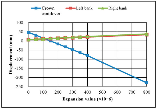 Figure 17 shows the change process of dam crest displacement along the river under different expansion values in basic combination III. Under the normal water level + temperature rise condition, the deformation of the crown cantilever along the river gradually changed upstream with further expansion, whereas that at the dam abutment varied downstream. However, the deformation did not change suddenly, indicating that the overall dam body was in a linear elastic state when the expansion value was lower than 800 με, and no instability and failure occurred on the whole.