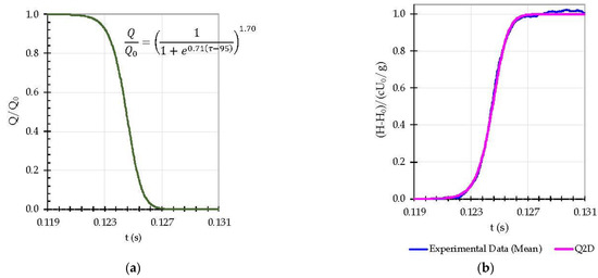 In the current study, the considered manoeuvre has total and effective closure times of 0.045 and 0.005 s, respectively. Accordingly, the experimental and Q2D models’ calibrated results are presented in Figure 4. The calibrated flow rate variation is shown in Figure 4a. The piezometric head obtained in the Q2D model fits almost perfectly with the collected data (Figure 4b).