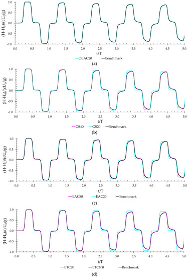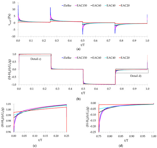 The OEAC40 N5% = 30 mesh allows an almost perfect adjustment to Zielke’s results (Figure 8a), whereas the OEAC40 N5% = 10 mesh leads to a maximum wall shear stress four times lower than the Zielke’s value. This shows that the higher the number of cylinders in the high-resolution area, the more accurate the prediction of the maximum wall stress and of the subsequent decay. A second aspect concerns the relation between the wall shear stress peak values in the deceleration (t/T = 0 and t/T = 0.25) and the acceleration (t/T = 0.50 and t/T = 0.75) phases. For the meshes with higher resolution near the wall (NHR ≥ 20), the peaks decay with time, as in the Zielke model; on the contrary, for the low resolution mesh (Figure 8c), the peaks increase compared with the previous surge for t/T = 0.25 and t/T = 0.75, as observed for the standard meshes (Figure 8a).