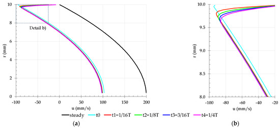 Axial velocity for four instances equally spaced in time during the first pressure wave: (a) complete pipe radius, 0 ≤ r (mm) ≤ 10; (b) close to the pipe wall, 8 ≤ r (mm) ≤ 10.