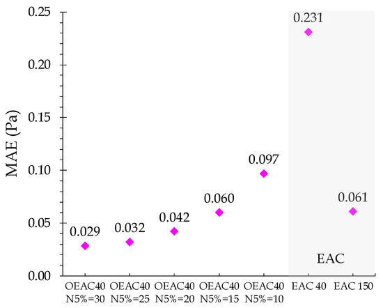 The MAE calculation for the wall shear stress simulation during the first pressure wave period (0 < t/T ≤ 1) confirms the previous assessment (Figure 9). MAE shows an almost exponential increase along with the NHR reduction. For the same number of cylinders, the EAC40 mesh results have an error almost 10 times higher than that of the best OEAC mesh (OEAC40 N5% = 30). The EAC150 results present the same MAE as the OEAC40 N5% = 15 and a higher error than when using a higher NHR value. This analysis highlights that a higher accuracy can be achieved with one-quarter of the number of standard mesh cylinders (40/150). OEAC mesh’s results are clearly better than those obtained for the EAC grid, considering the same (EAC40), or even a higher (EAC150), value of the total number of cylinders.