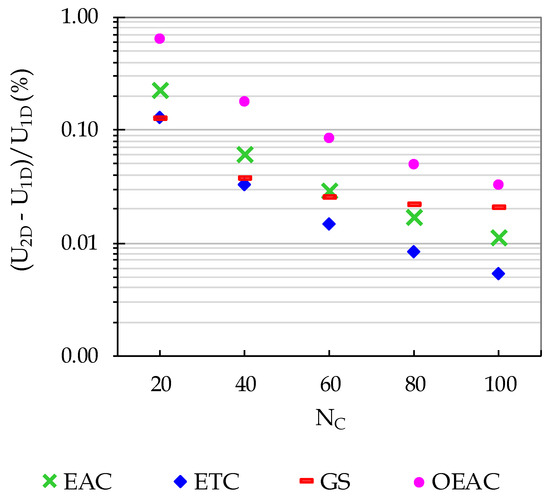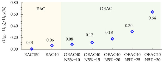 The Q2D model simulation accuracy for the mean velocity and piezometric head depends not only on the unsteady wall shear stress calculation, but also on the steady-state velocity profile calculation. Figure 10 shows the relative steady-state mean velocity error for EAC and OEAC meshes, described by , in which 1D is the steady-state mean velocity obtained by Hagen–Poiseuille solution and U2D is the Q2D model steady-state flow approximation for each mesh. Firstly, OEAC meshes have a worse steady-state velocity representation than the EAC meshes (i.e., the EAC40 mesh leads to a lower error). Secondly, this error increases exponentially with the NHR increase. The OEAC40 N5% = 10 mesh has a 0.08% error, which is close to EAC40 (0.06%), but the OEAC40 N5% = 30 error rises to 0.64% (i.e., 8 to 10 times higher).