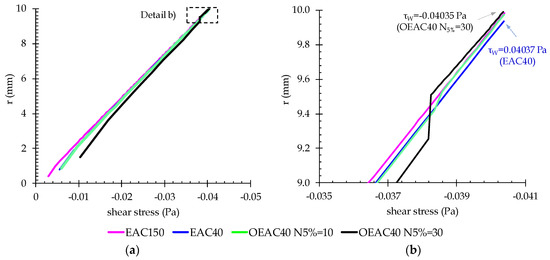 Shear stress profile for EAC40, EAC150, OEAC40 N5% = 10 and OEAC40 N5% = 30: (a) 0 ≤ r ≤ 10 mm; and (b) 9.0 ≤ r ≤ 10 mm.