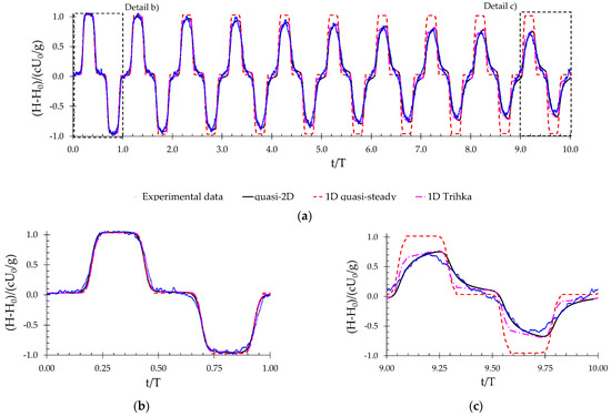 As expected, a more precise wall shear stress calculation leads to a better piezometric description. For the NC = 20 mesh, the Q2D model piezometric-head results (Figure 5b–d) do not depict the correct wave shape (the round-shape), showing a square shape geometry, and present a poor calculation of the wave damping (e.g., for t/T = 0.25, the difference to the 1D model is noticeable). Increasing the number of cylinders allows progressive approximation of Zielke’s results.
