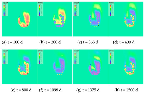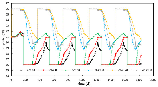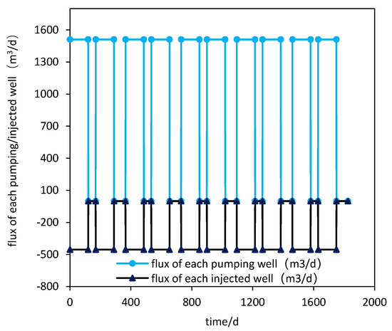 | F3 | In the cooling period, 1#, 3#, and 5# with the flux of 1512 m3/d, while in the heating period, 10#, 12#, and 13# with the flux of 1512 m3/d | In the cooling period, 8#, 9#, 10#, 11#, 12#, and 13# with the recharge flux of 756 m3/d, while in the heating period, 1#, 2#, 3#, 4#, 5#, and 6# with the recharge flux of 756 m3/d |