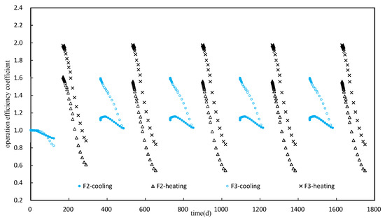 | F2 | In the cooling period, 4#, 6#, and 8# with the flux of 1512 m3/d, while in the heating period, 1#, 6#, and 8# with the flux of 1512 m3/d | In the cooling period, 1#, 2#, 10#, 11#, 12#, and 13# with the recharge flux of 756 m3/d, while in the heating period, 3#, 4#, 8#, 9#, and 10# with the recharge flux of 756 m3/d |