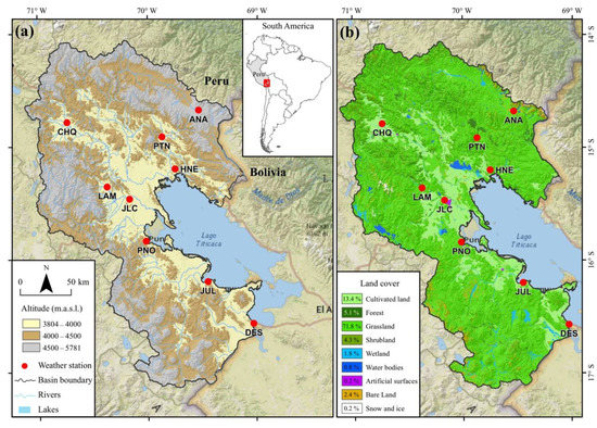 The study area is located in the Peruvian Lake Titicaca basin (PLTB). It is characterized as an endorheic basin system surrounded by the eastern and western mountain ranges. It limits to the north with the Amazon hydrographic region, to the south-west with the Pacific hydrographic region and to the east with the PLT of the Republic of Bolivia, with an altitude (Figure 1a) that varies from 3804 to 5781 m.a.s.l. According to the climatic classification of Peru, the PLT has a predominantly rainy climate type, with dry autumn and winter [31].