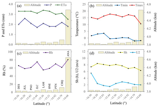 Variation of climatic factors as a function of latitude and altitude (a) P and ETo (b) Tmin and Tmax, (c) Rh and (d) Sh and U2.
