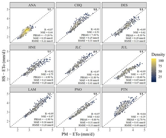 Figure 4 illustrates the comparison of ETo estimates by the original HS method versus the PM method. The value of KRS considered for the HS equation was 0.17 °C−0.5 for all weather stations. The precision of the ETo values of the original HS equation had significant variations in the SH-h and SH-d climatic zones identified in the study area (Table 1). The scatter diagrams reveal that the values of the correlation coefficient (R) within the two climatic zones oscillated between 0.84 and 0.97, presenting lower values in the ANA and PTN stations and higher values in the PNO and JLC stations. On the other hand, in relation to the values of the NSE vary between −0.57 and 0.87, NSE values lower than 0.50 were presented in the PTN, JUL, JLC and ANA stations, indicating poor performance. Meanwhile, values higher than 0.75 were presented in the of HNE and LAM stations, indicating very good performance according to the discretion of Moriasi et al. [43].
