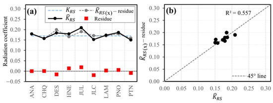 Regionalization of the calibrated radiation coefficient of the HS equation as a function of longitude, latitude and altitude: (a) variation of the original KRS, calibrated, and residuals; (b) scatterplot between and interpolated without addition of the residual.