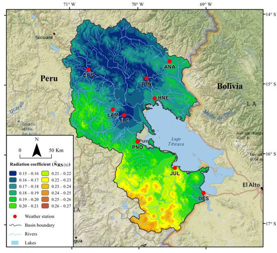 The values for the PA vary between 0.15 and 0.27. The spatial distribution is greater for the western, central and southern zone of the Altiplano, as it approaches the coastal areas; while lower values are observed for the northern zone there (Figure 7), these estimated values when regionalizing the radiation coefficient for the PA, are found in the range of the values reported by Samani [49] which oscillates between 0.12 and 0.24 °C−0.5, by Raziei and Pereira [5] obtained values that oscillate between 0.14 and 0.20 °C−0.5, while results obtained by Paredes et al. [50] show values that oscillate between 0.14 and 0.25 °C−0.5, respectively.