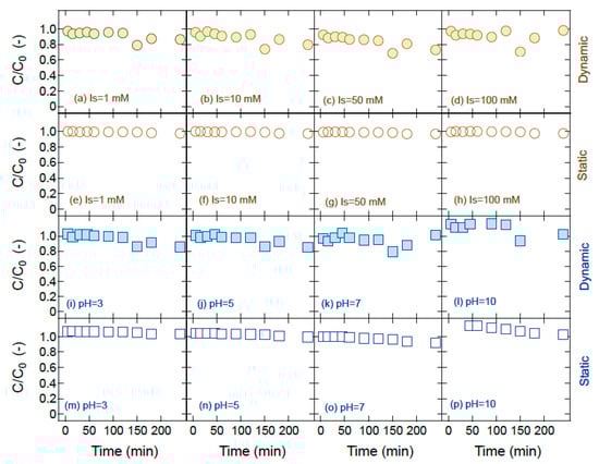 TM normalized concentrations during the batch adsorption experiments onto quartz sand under: dynamic conditions and four different Is values (a–d), static conditions and four different Is values (e–h), dynamic conditions and four different pH values (i–l), and static conditions and four different Is values (m–p). Here the initial TM concentration is C0 = 10 mg/L.