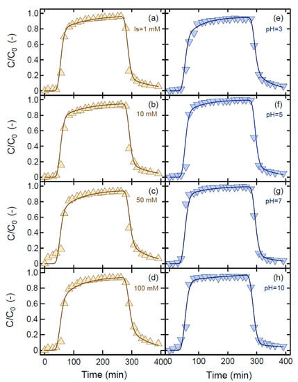 The normalized TM breakthrough concentrations (C/C0) and the corresponding fitted curves as a function of time are presented in Figure 3 for the transport experiments in water-saturated columns packed with quartz sand. The effect of four different ionic strength values (Is = 1, 10, 50, and 100 mM) is shown in Figure 3a–d, whereas the effect of four different pH values (pH = 3, 5, 7, and 10) is shown in Figure 3e–h. All breakthrough curves were successfully fitted with the nonlinear least squares regression software ColloidFit. The experimental conditions, together with the estimated mass recoveries and the fitted parameters, for each case considered in this study, are listed in Table 2.