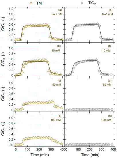 The collected breakthrough experimental data, together with the model fitted curves for the TM and TiO2 cotransport experiments, for several different ionic strengths (Is = 1, 10, 50, and 100 mM) and pH values (pH = 3, 5, 7, and 10) as a function of time, are presented in Figure 4 and Figure 5, respectively. Note that the mass recovery values for ΤΜ were considerably lower in the presence of TiO2 compared to the single transport experiments, where Mr = 100% was observed. The measured zeta potentials for TiO2 in the various experiments, which are listed in Table 1, suggested that the zeta potential for TiO2 was affected during the various experiments. The observed negative increase in the zeta potential, and thus an increase in stability, was not only due to the increase in pH but also due to possible TM sorption onto TiO2. The observed reduced mass recovery of TM during the cotransport with TiO2 could also be explained by the possible sorption of TM onto TiO2 nanoparticles. Previous studies have shown that fungicides can act as capping agents for metal nanoparticles. Malandrakis et al. [] demonstrated such a capping effect of ZnO nanoparticles when applied in combination with the fungicide boscalid against the plant pathogen Alternaria alternata. A similar interaction between TM and silver nanoparticles was reported in a study by Zheng et al. [], who developed a colorimetric array for the detection of TM adsorbed onto silver nanoparticles. The fitted parameter values for TiO2 and TM concentrations are listed in Table 2. The mathematical model presented in this work successfully fitted the experimental breakthrough data. It should be noted, however, that the experiments for Is = 50 and 100 mM (see Figure 5g,h) caused extreme retention of TiO2 inside the column (Mr < 5%). Consequently, it was very hard for the cotransport model to produce meaningful and unique parameter values. Therefore, these two experimental data sets were excluded from the fitting process.