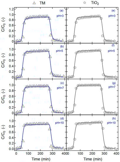 Adsorption is a process that is used to effectively remove hazardous organic as well as inorganic impurities from aqueous solutions []. Adsorption can be a simple and inexpensive wastewater treatment process if adsorbents that are abundant in nature are employed []. Since the adsorption process is associated with surface reactions, the physical and chemical properties of the adsorbents used can significantly affect the adsorption efficiency []. Furthermore, nanoparticles and carbon-based adsorbents are known to exhibit high efficiency in removing pesticides from aqueous systems []. To the best of our knowledge, although various procedures for pesticide removal using nanoparticles have been proposed in the past [,], the use of TiO2 nanoparticles for TM removal under different pH and ionic strength conditions has not been previously examined. The present study focuses mainly on the effect of TiO2 nanoparticles on the removal of the TM pesticide in water-saturated porous media and explores the behavior of TiO2 and pesticide cotransport. Furthermore, the experimental data collected in this study were successfully fitted with a cotransport numerical model previously published in the literature, which was properly modified to account for the irreversible sorption of TM onto TiO2 nanoparticles. Finally, columns packed with quartz sand were used as a typical filtration system.