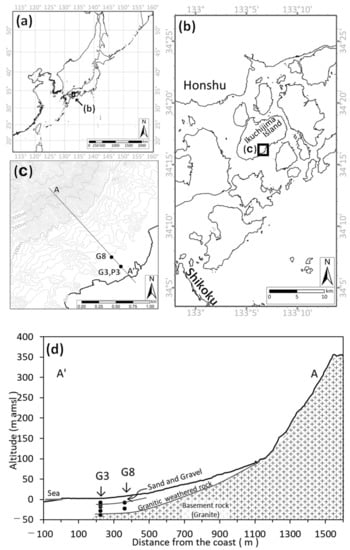 Observation site. (a) Map of Japan. (b) Map of Ikuchijima Island and its surrounding areas. (c) Contour map of the watershed area with the locations of G3 and G8 across A-A’. (d) Cross-section of A-A’.