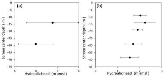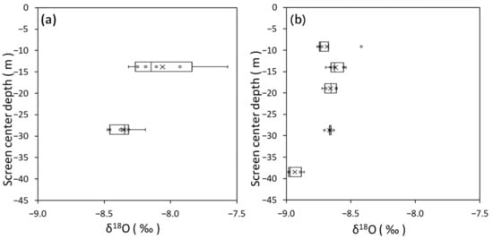 Figure 3 shows the central depth of the screen of each observation well, average δ18O value, and fluctuation range (error bar) at G8 (Figure 3a) and G3 (Figure 3b). In Japan, temporal variations in groundwater isotopic ratios are generally much lower than that of precipitation. This observation is due to the stabilization of seasonal variations in precipitation values during the recharge process, which results in a constant value. For example, the stable isotope ratio vertical profile observed at Tsukuba, a hydrogeological condition with a thick unsaturated zone where seasonality has been confirmed in precipitation and isotope ratios of precipitation, shows cyclic fluctuations down to a depth of about 4 m but not deeper than that (Yabusaki et al. 2011) [38]. The change in δ18O at G8 was relatively large (−8.3 to −7.5‰) at G8-15 and was approximately −8.4‰ at G8-30, whereas, at G3, it was approximately −8.7‰ for G3-10, G3-15, G3-20, and G3-30 and approximately −8.9‰ for G3-40. Moreover, based on the aforementioned hydraulic heads, a downward flow occurred below G3-15. Therefore, from G3-10 to -30, the water was well dispersed instead of in independent streamlines.