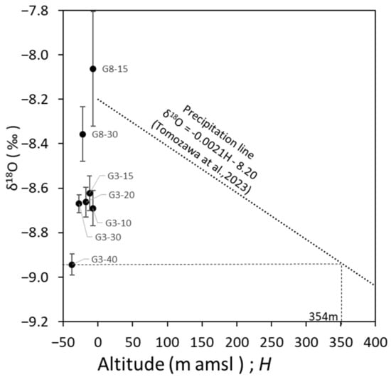 These results can be used to estimate the groundwater recharge area. In Japan, which has steep topographies, the recharge altitude of groundwater was determined while considering the effect of precipitation infiltrating the ground; therefore, a groundwater recharge line is used, which is created using several spring points with known topographical recharge altitudes [40,41]. Asai et al. (2009) [26] compared the groundwater recharge lines and precipitation lines obtained from springs with small catchments (<1 km2) at Ontake Volcano (elevation 3067 m) and confirmed that there was a difference. However, in the Ikuchijima Island observation area, long-term continuous observations were challenging, as there was relatively less spring water points. Therefore, in this study, to estimate the extent of groundwater recharge, the precipitation line was assumed to be the groundwater recharge line, and the actual topography was evaluated. The altitude and average δ18O of the groundwater sampling points are plotted in Figure 4. The error bars indicate the minimum and maximum δ18O values for that location. The recharge altitude can be determined from the intersection of the horizontal line passing through the groundwater value and the precipitation line. For example, the recharge altitude of G3-40 was 354 m. The topography of the area corresponding to each groundwater recharge altitude was estimated as follows: G8-15 is near a plain; G8-30 is a fan-shaped area; G3-10, G3-15, and G3-20 are alluvial areas; and G3-30 and G3-40 are mountainous areas.