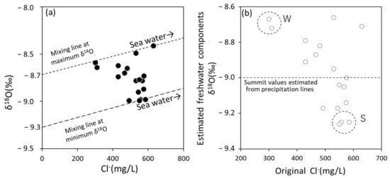 Figure 5b shows the estimated relationship between the δ18O and Cl− concentrations in fresh groundwater. Although some outliers were observed, the δ18O of fresh groundwater was low when the Cl− concentration was high—that is, when the seawater component was abundant.