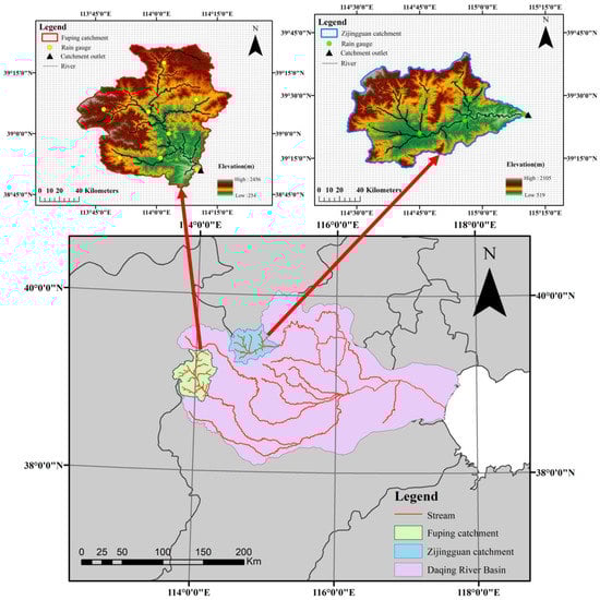 Two mountainous catchments in the Daqing River Basin were selected as the study area, namely, the Fuping catchment in the south branch and the Zijingguan catchment in the north branch (Figure 1). The Daqing River Basin is located in North China, which has a typical semi-arid, semi-humid, warm continental monsoon climate. The Fuping and Zijingguan catchments cover areas of 2210 and 1760 km2, respectively. The elevation decreases from northwest to southeast with great variation, which produces a short flood confluence time. Coupled with high-intensity and short-duration precipitation, this has the potential to cause severe flood disasters. Most rainstorm events occur in the flood season (from June to September). There are 8 and 11 gauges located in the Fuping and Zijingguan catchments, respectively, and the streamflow is measured at the catchment outlets (Figure 1). These two catchments can represent the underlying surface characteristics of the small catchments in the mountainous area of Daqing River Basin, which is prone to flood disasters, and they are typical representatives of flood-prone mountainous areas in northern China.