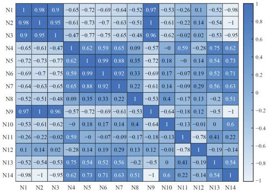 In this section, the Gamma test was used to select the combination of variables (from numbers 1–14 in Table 2) that had significant impacts on the generation of the grid runoff of the catchment, and the results of the forward and backward selection are shown in Table 3. As explained in the two-step variable selection, Variables 15 and 16 were treated as the model outputs for spatial variable selection, so these two variables are not considered in the spatial dimension. It was found that the variable combination of 2, 3, 4, 5, 7, 8, 9, 11, 12, 13, and 14 had the best performance (with the minimum value). Correlations of the variables in the spatial dimension are also shown in Figure 3, in which it can be seen that the correlations between variables 1, 2, 3, and 9 and those between variables 5, 6, and 7 were relatively stronger (>0.90). A strong correlation indicates some degree of substitutability between the variables. Therefore, it is suggested that strongly correlated variables are not necessarily involved at the same time in the input combination.